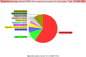 As can be seen from the UN’s own statistics – see chart above – these two countries account for by far the majority of the registered schemes, taking a 70 percent share of the total. And, of the two, China is by far the bigger player, averaging 197,792,890 CERs as against 38,308,631 from India.