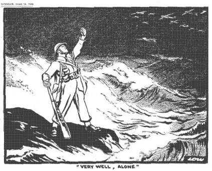 It is not, of course, that we do not agree with the sentiment, but the front cover tells you everything you need to know about the eurosceptic thinking in this country. Redolent of the famous 1940 Low cartoon (inset below), it has the trademark Express crusader standing on the cliffs of Dover, looking out toward the Continent – where (by inference) the “enemy” exist.