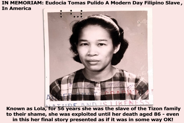 Her name was Eudocia Tomas Pulido. We called her Lola. She was 4 foot 11, with mocha-brown skin and almond eyes that I can still see looking into mine—my first memory. She was 18 years old when my grandfather gave her to my mother as a gift, and when my family moved to the United States, we brought her with us. No other word but slave encompassed the life she lived. Her days began before everyone else woke and ended after we went to bed. She prepared three meals a day, cleaned the house, waited on my parents, and took care of my four siblings and me. My parents never paid her, and they scolded her constantly. She wasn’t kept in leg irons, but she might as well have been. So many nights, on my way to the bathroom, I’d spot her sleeping in a corner, slumped against a mound of laundry, her fingers clutching a garment she was in the middle of folding.